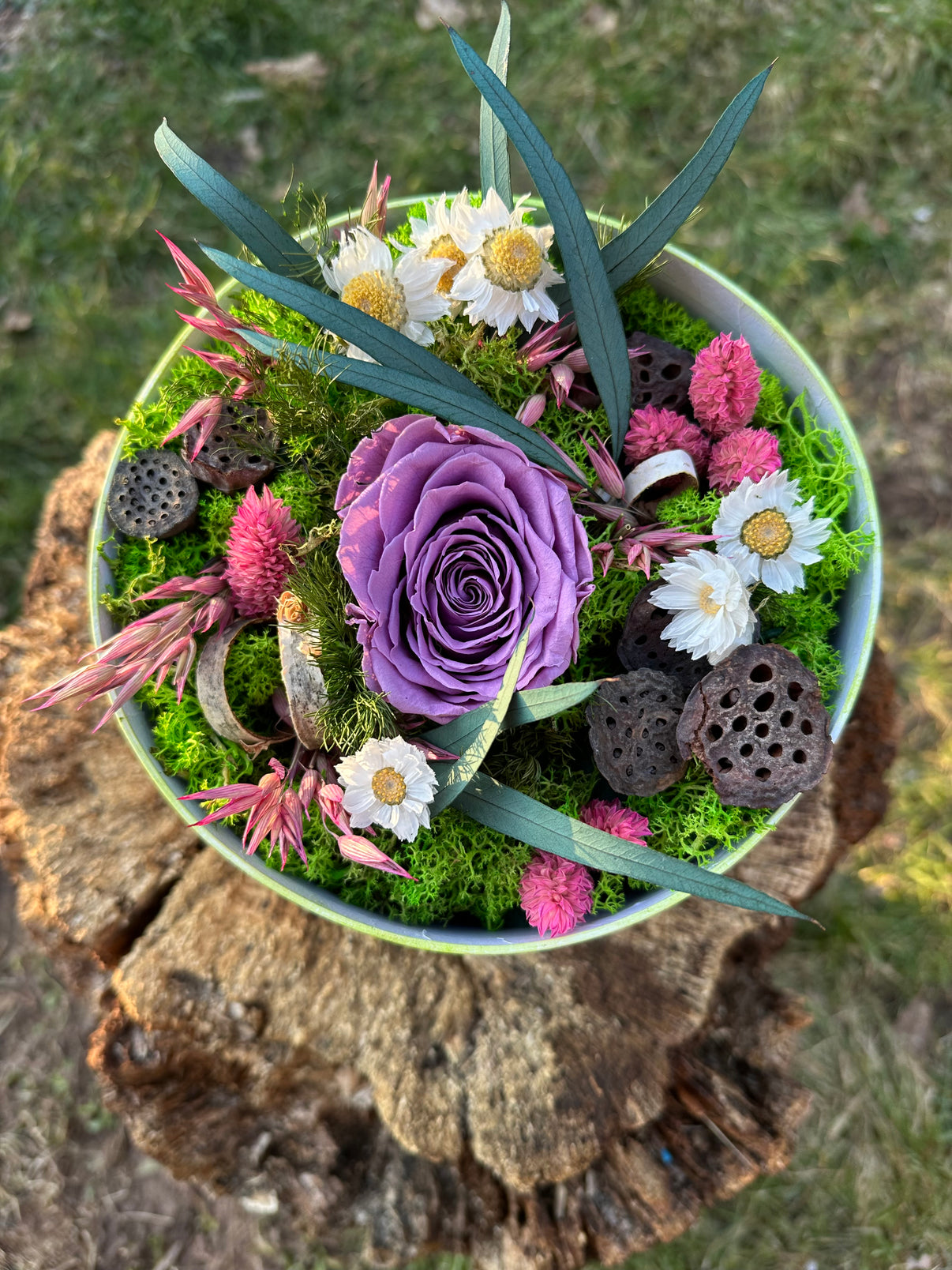 • Boite à chapeaux violette accompagné de mousse d’Islande verte, de lotus, Eucalyptus, pâquerette blanche et des graminées