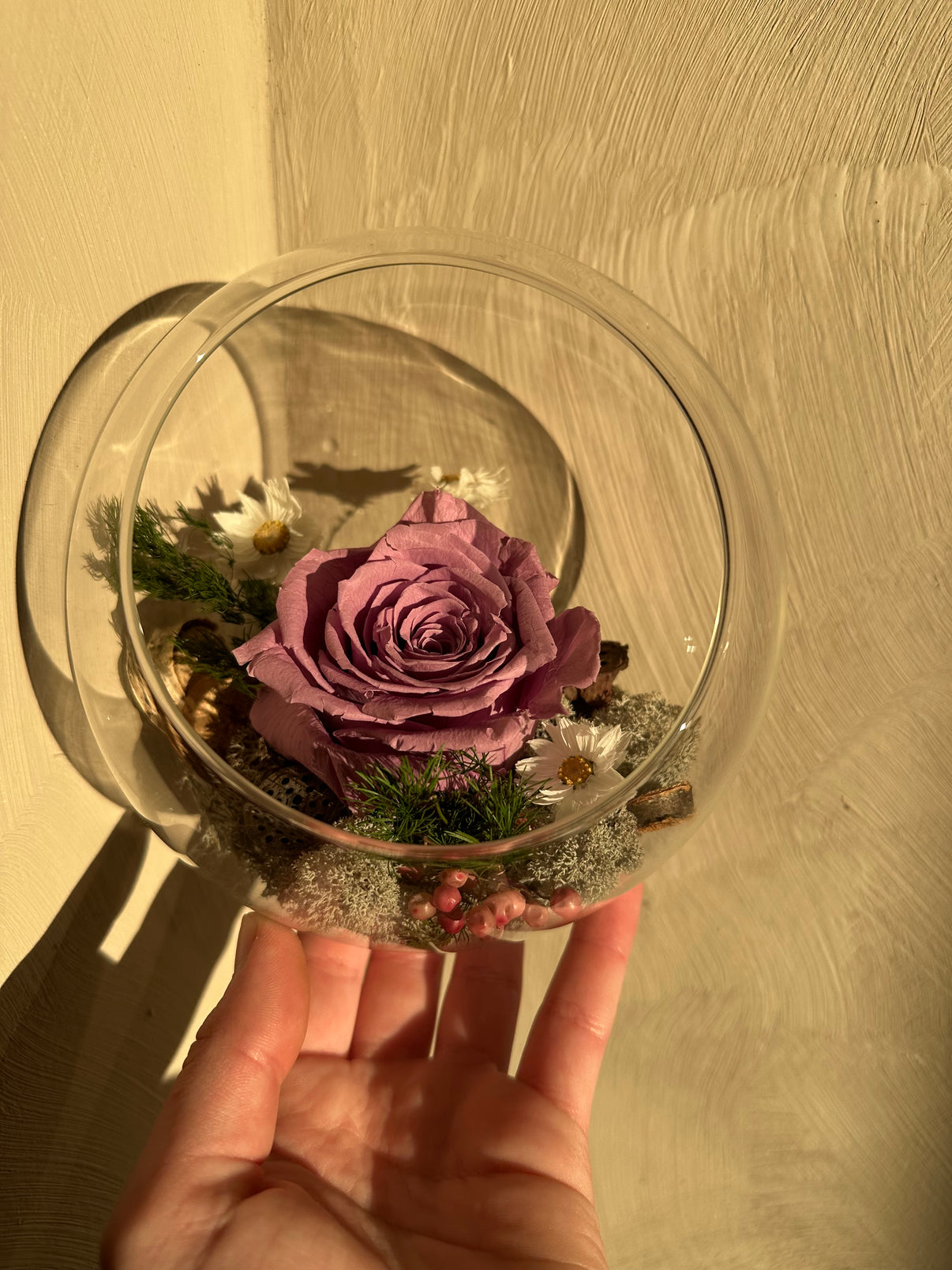 • Rose violette sur sa mousse d’Islande blanche, il est accompagné de lotus séchée, d’écorce de bois et de fleurette blanche